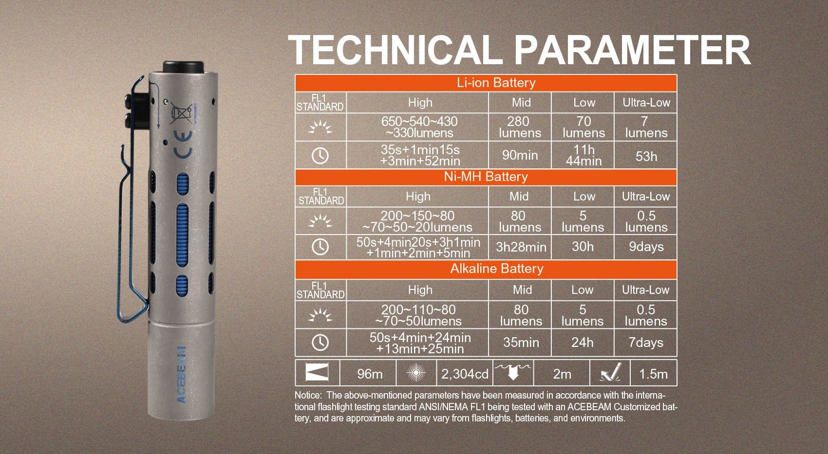 - Peak Beam Intensity: 2,304cd